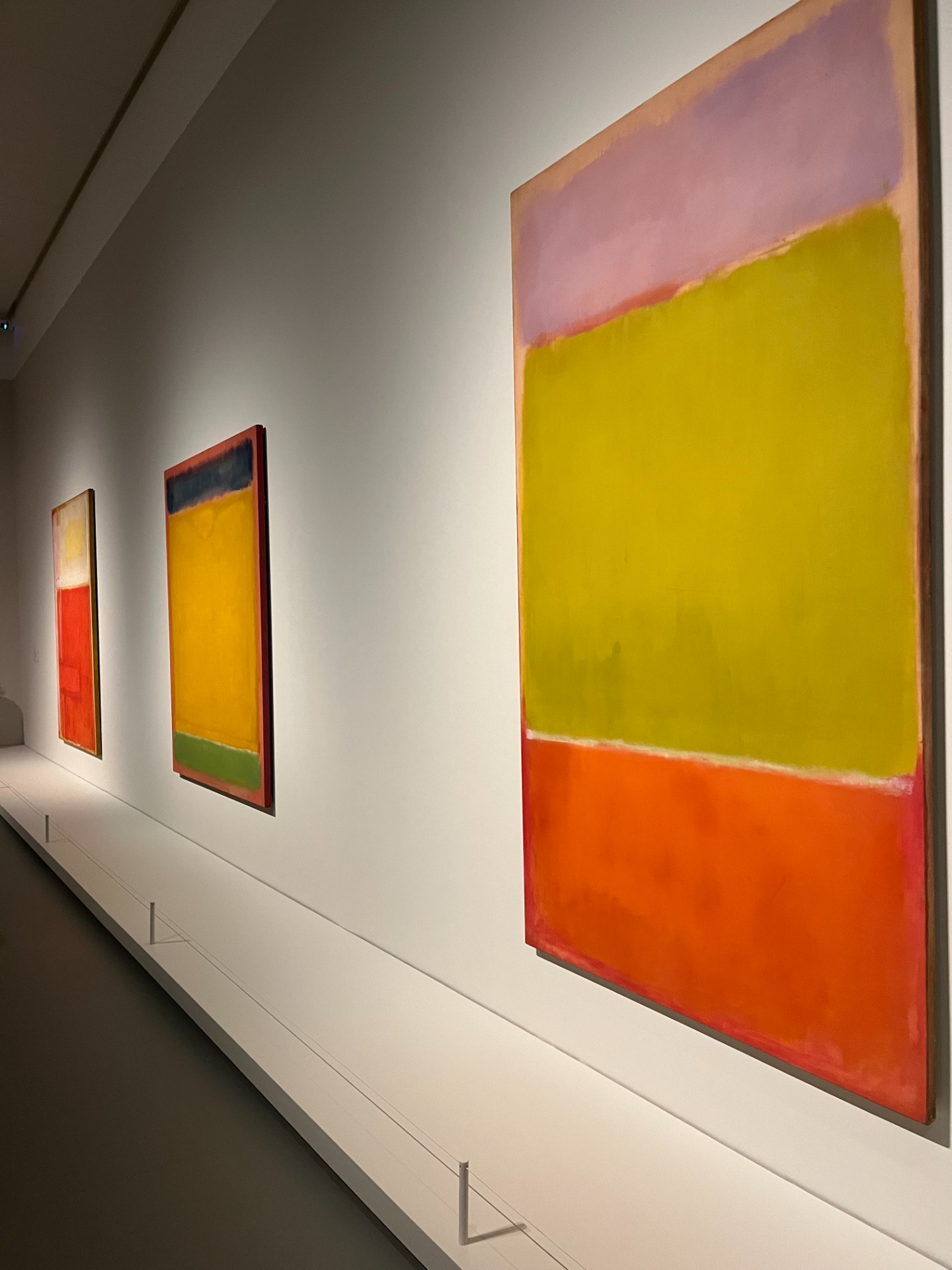 Dans une suite chronologique, en 1950, les productions de Mark Rothko se font reconnaître avec ses quelques rectangles colorés qui se superposent. Avec une variation infinie de tons et de tailles, les tableaux dégagent un sentiment d'apaisement et constituent un repère dans ce monde en reconstruction. Mark Rothko affirme rechercher la lumière . Les formats de tableaux ne cessent de s'agrandir jusqu'à nous dominer !